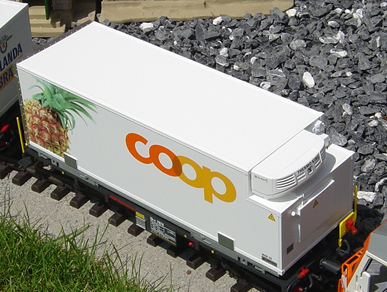 Flachwagen wurden speziell auf die Bedürfnisse des kombinierten Verkehrs Strasse / Schiene zugeschnitten. Wechselbehälter und Container finden auf den Tragwagen bequem den Weg zum Kunden und können so auch als wirkungsvolle Werbeträger genutzt werden. Hier wird Werbung für Calanda-Bier und die Coop-Detailhandelskette gemacht. |