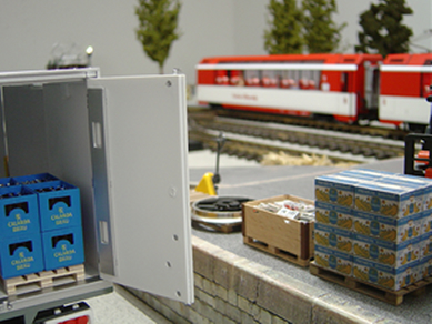 Der Container ist schon vom Zug auf den Lastwagen umgeladen. Durch die offene Türe werden die Harasse mit dem kühlen Calanda-Bier sichtbar. |